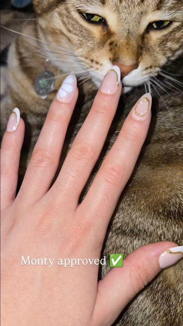 Ten handpainted press-on nails using premium gel polishes and nail tips. Multiple gel layers = glossy, durable, long-lasting wear. These are gel extensions, not acrylic/plastic.